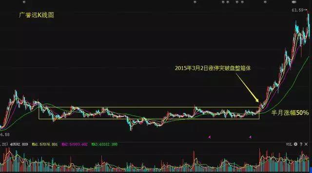 第 一,经过长期盘整后出现的第一个涨停板,第二,盘整时间最少四个月以上,时间越长越好,盘整后期震幅约30%左右,第三,放量涨停,当天成交量是近期的 2--5倍(最近5个交易日的平均值,可从量比判断)第四,5、10、20、60日均线多头排列;买入:激进派可在涨停第二天开盘价买入或者前一天收盘价 附近买入。案例广誉远,2015年3月2日涨停突破近一年的盘整,随后一波半月50%涨幅