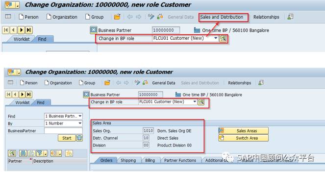 BP角色FLCU01 将客户扩展到销售区域。