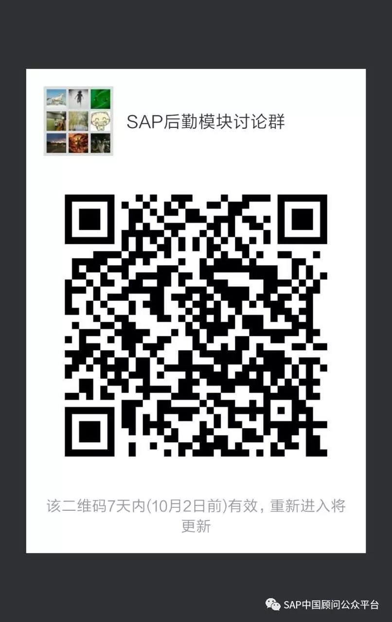 【SAP 后勤模块讨论群】全国顾问、用户、企业之间互动,内部交流,如100人已满,请先加好友 “ saprain ”, 邀请入群。