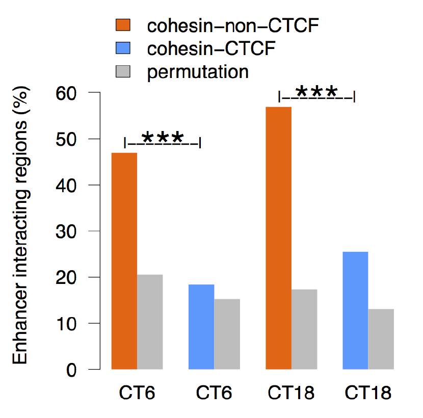 为了验证昼夜基因的表达与染色质结构蛋白的关系。他们分析了在超级增强子上下游组蛋白以及Bma1/cohesin/CTCF的情况,发现增强子核心区域有cohesin的富集,而CTCF则没有显著的富集,同时他们还考察了增强子区域Interaction cohesin和CTCF富集的情况,发现无论是CT6还是CT8 cohesin-non-CTCF的比例都高于cohesin-CTCF组。