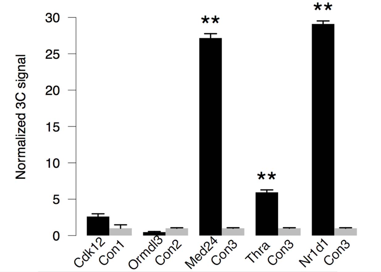 以超级增强子作为bait,进行4C实验,发现在CT6 中节律振荡基因Fbxl20, Cdk12, Med24, Thra, 和Nr1d1都与增强子存在显著互作另一个节律振荡基因Cdk12与增强子存在较弱的互作,而一个非节律振荡基因Ormdl3,则显示比对照更弱的相互作用,利用3C-定量PCR实验表明,Nr1d1, Thra, Med24与增强子的互作相比邻近的片段具有6-30倍的富集。
