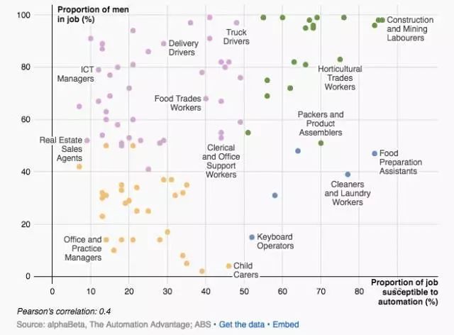在上图中,更容易自动化的工种位于图的右侧,而男性工作比例较高的工作位于图的上方。