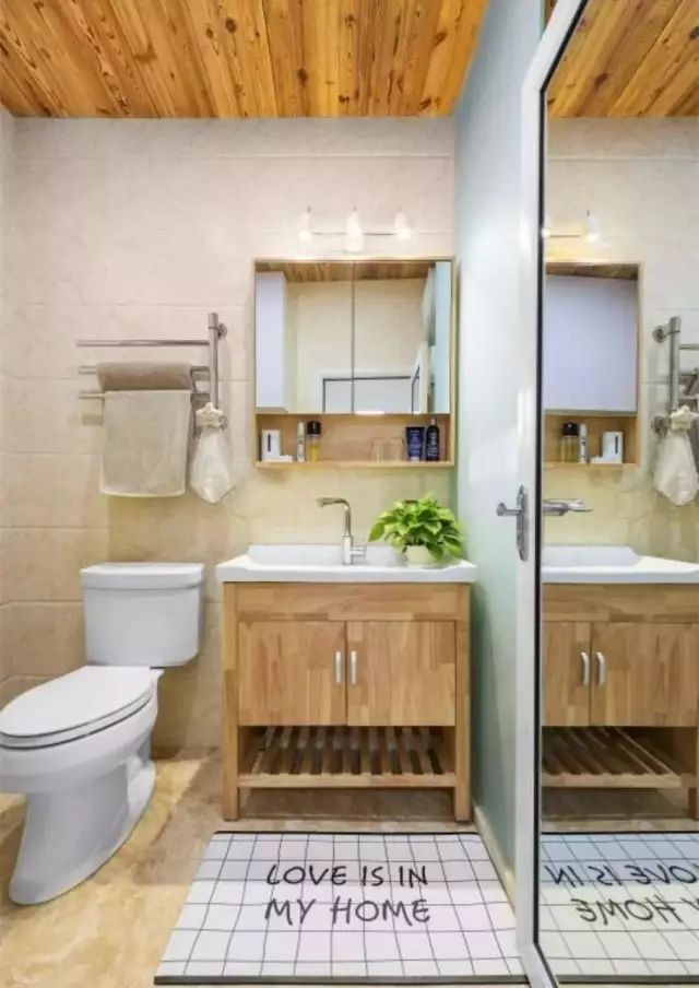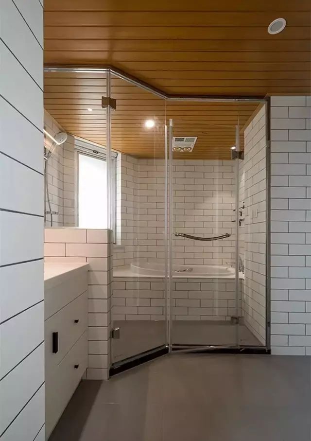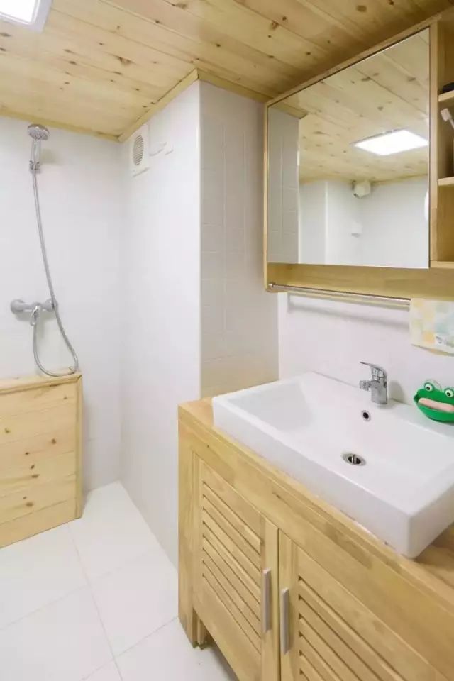 使用防水石膏板,再刷防水漆做吊顶。色调一致,整体达到和谐统一的美观效果。