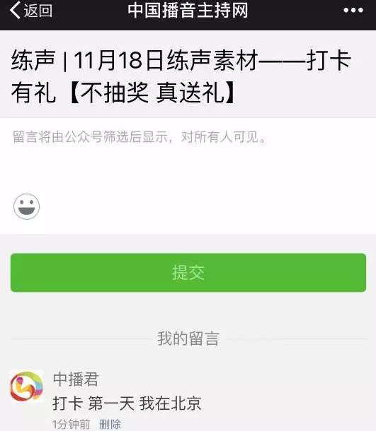 ps:已经陆续收到大家打卡满30天的邮件啦,编辑正在核对中,中播君再次强调一次,是连续打卡满30天哦!发过来的邮件里,只需要的是你连续打卡满30天的就好,不需要多发截图。邮件里截图请按照顺序排列!因为邮件众多,请大家发过来时,尽量不要出现补发几张截图这样的邮件。出现遗漏的,请全部重新发一份过来。谢谢!之所以举办这个打卡有礼的活动,初衷也是为了鼓励大家练声,中播君希望把礼物送到真正需要它的人手上。礼物是随机的!感恩!