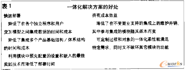 PLM体化解决方案拥有多种能力,包括产品数据管理、设计协作和项目管理、动态设计配置、零件管理以及制造协作。制造商不再需要把各种不同的系统拼凑到一起了。实施一体化解决方案具有以下这样一些好处(如表1)。