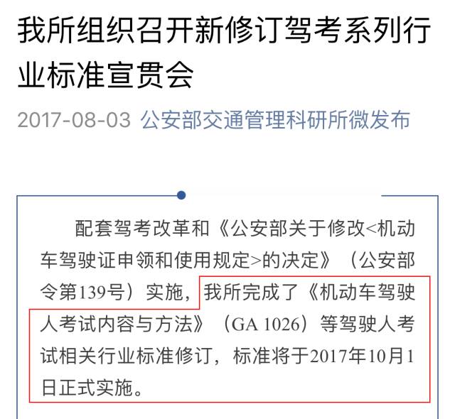 8月,公安部交管局科研所官方微信发布消息,新修订的 《机动车驾驶人考试内容和方法》(GA 1026)将于10月1日起实施,详细规定了新的驾考评判标准。其中许多考试项目增加了时间限制,直接评判不合格的操作也有所增多 。