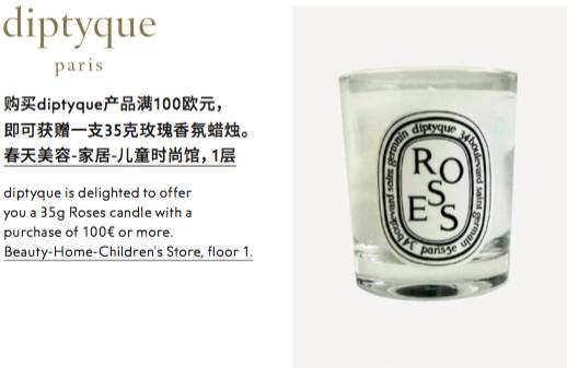 香薰蜡烛这种很少女心的美好小物,法国品牌diptyque一直都有超赞的口碑,而且最要命的是格调高又不烂大街,欧洲菌每次拿去送小姐妹都会被表扬1个月。。。满100欧元就能获赠一支35克玫瑰香氛蜡烛哦。