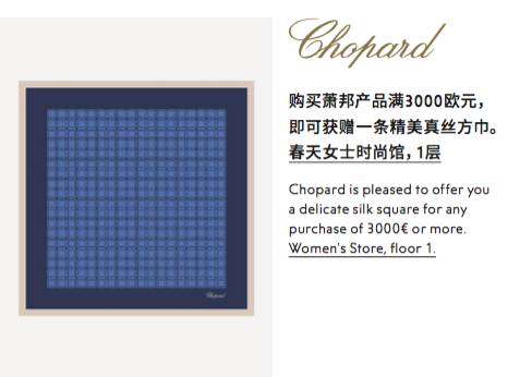 购买萧邦产品满3000欧元,男孩子能送给心上人的就不只是珠宝,还能再送一条精美真丝方巾。