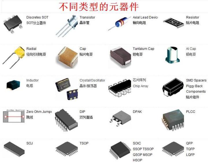 电子元器件包括:电阻、电容器、电位器、电子管、激光器件、电子显示器件、光电器件、传感器、电源、开关、继电器、印制电路板等。相同元器件之间又有不同的封装和性能等指标。