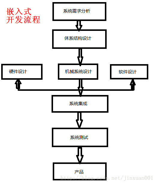 下图是一个嵌入式开发流程,主要涉及系统需求分析、体系结构设计、硬件设计、机械系统设计、软件设计、系统集成、系统测试、生产产品等内容,其他技术大同小异。