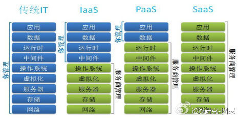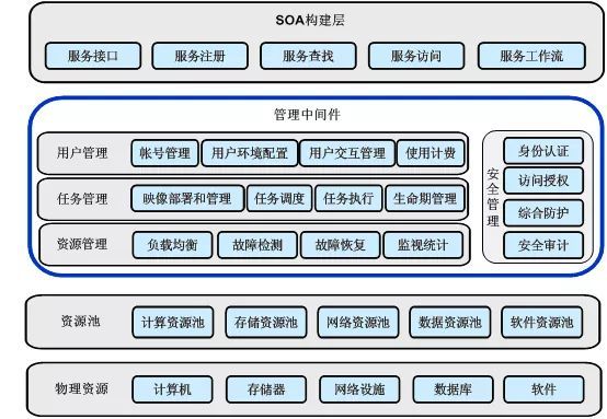 其中,管理中间件和资源池层是云计算技术的最关键部分,SOA构建层的功能更多依靠外部设施提供。