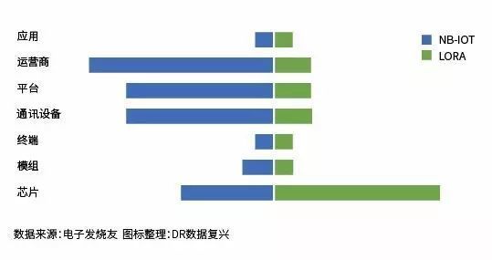 下面小宅选取目前已形成较为完善产业生态的NB-IoT和LoRa两种技术标准,对每一环节的市场集中度进行大体预估,集中度的大小反映在下图对应矩形框的长度,长度越长,集中度越高,长度越短,集中度越小,(集中度越高表示市场垄断率越高)。