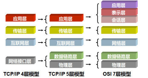 TCP/IP协议栈是美国国防部高级研究计划局计算机网(Advanced Research Projects Agency Network,ARPANET)和其后继因特网使用的参考模型。TCP/IP协议栈与ISO/.OSI七层模型的关系对比,请看下图。