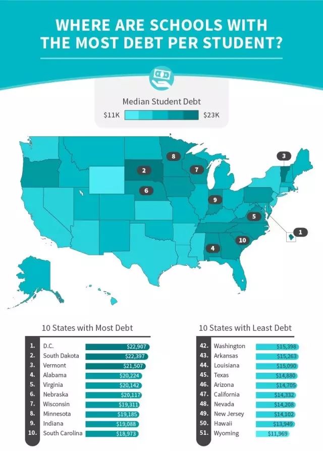 美国各州院校学生就读期间负债情况
