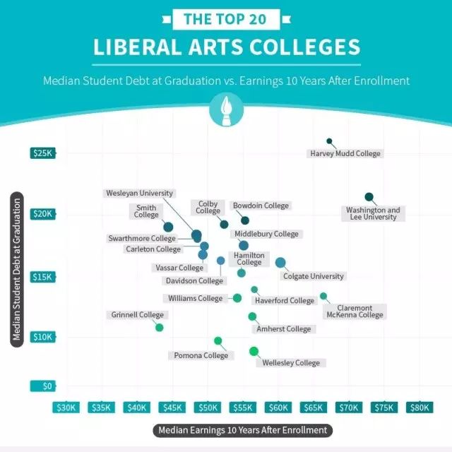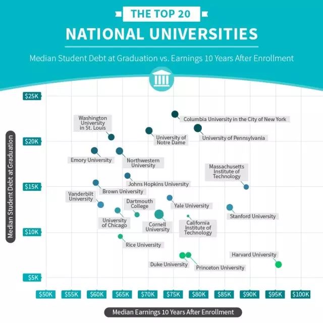 哈佛大学作为世界级顶尖院校,其学生在校期间负债水平最低,毕业后收入水平也是相当可观。因此,当作为美国大学申请者的你足够优秀时,不如把图中的学校列入你的选择清单~
