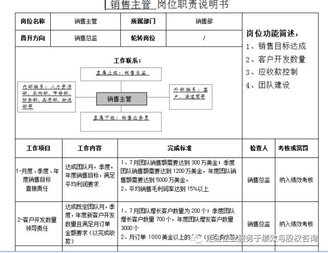 你会发现大家各自专注,既简单,又容易做到,又有动力,可是很多企业根本不来这一套。举例,我搞销售的,有销售总监,销售总监下面还有副总监,你会发现,通常企业怎么考?总监,12345678910--20;副总监,12345678910--20;是不是这样考的?是的。完全错了。交叉嘛。这总监可能业务很好,副总监可能在家里管内务的比较多,总监我考他业务的部分,副总监,我考他人员流动,内部管理,培训等等,然后有一部分跟业务挂钩,两个人就配合的非常好嘛。
