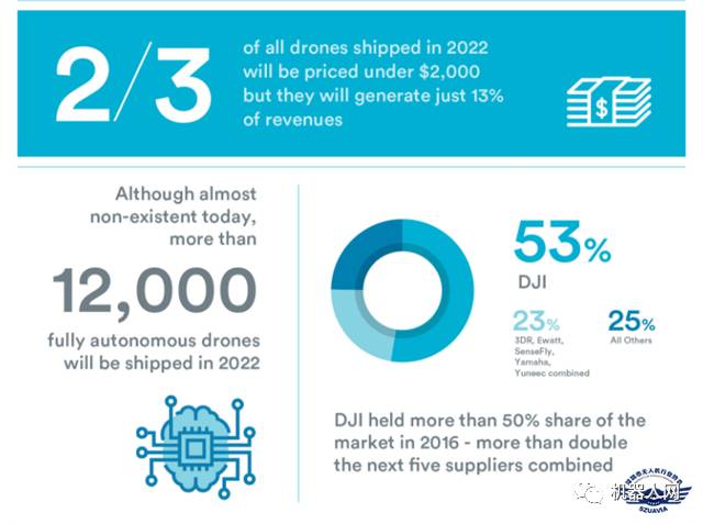 目前,价格门槛较低的无人机(通常指价格低于2000美元,即13000人民币)主导着无人机市场,到2022年,它们将占据全球无人机出货量的三分之二;但有趣的是,五年后它们预计只占无人机市场总收益的13%,因为无人机企业正向着“工业级”转型。