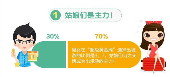 男女在“超级黄金周”选择出境游的比例是3:7,姑娘们当之无愧成为出境游的主力!