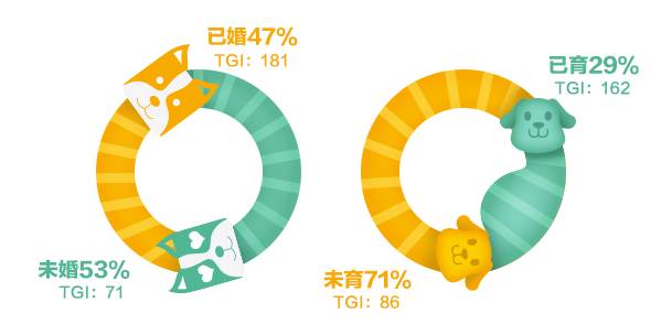 已婚占比47%,已育占比29%,渗透率高。