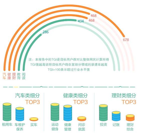 对比整体网民,本次超级黄金周出境游人群对汽车、健康、理财、教育等应用需求较高。