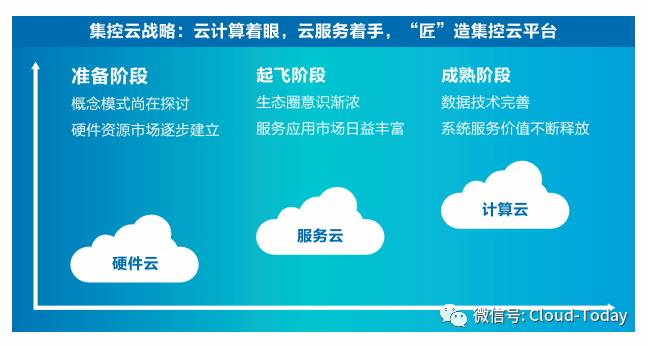 —— 集控“云”平台——云平台:集控云战略在集控的云视角里,云的发展必须经历三个阶段,即:硬件资源云- 服务云- 计算云,在制造业信息化领域的这三个阶段里,同时都会具备这三个应用层面,不同的是在各个阶段,关注和解决的重心也将由硬件资源到服务应用再到大数据计算分析。当下,大多停留在IAAS 的基础硬件资源的市场应用,通过公共云与混合云实现,从而降低客户的应用与维护成本,而支撑主要业务功能的SAAS 的应用逻辑更加扁平,真正提供完善的PAAS 平台服务及SAAS 的应用服务,在制造业领域尤为少见。集控正走在制造型企业云服务潮流的前端。