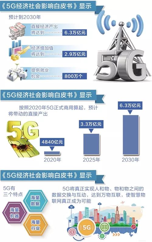 5G商用将让万物互联梦成真,到2030年有望带动经济产出6.3万亿元中国信息通信研究院发布的《5G经济社会影响白皮书》显示,预计到2030年,直接经济产出将达到6.3万亿元,经济增加值2.9万亿元,并提供800万个就业机会,推动我国数字经济发展迈上新台阶。