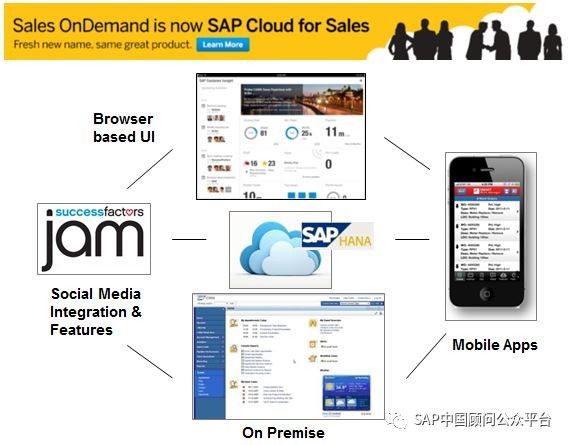 SAP Cloud for customer为客户提供比其前身更完整,更强大和成熟的解决方案。 它与SAP ERP和SAP CRM,移动接口,强大的社交功能的预包装集成。 整个产品可以被视为基于浏览器的Silverlight UI,JAM的集成社交功能,iOS和Android的丰富的移动应用程序集,SAP HANA for Integration场景的组合。 SAP PI也可以作为Integration的选择。