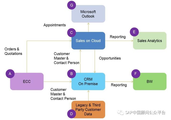 混合 Hybrid- 此解决方案将同时存在于CRM环境中的SAP CRM和SAP C4C。从以下角度来看,这是SAP CRM顾问最感兴趣的