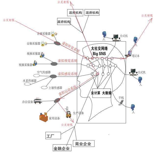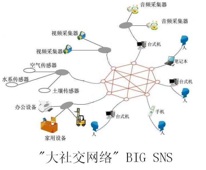 城市云脑神经网络是通过建立城市云脑的大社交网络最终实现的,一直以来,社交网络被认为就是互联网上人与人的交互社区。但随着物联网,云计算,大数据等新现象的出现,社交网络的形态也必将发生改变。当物联网,工业4.0,工业互联网与社交网络融合时,每一栋大楼,每一辆汽车,每一个景区,每一个商场,每一个电器都会在SNS网站上开设账号,自动的发布自己实时的信息,并与其他”人“,和“物”进行交互.社交网络的定义将不再仅仅是人与人的社交,而是人与人,人与物,物与物的范围更大的社交网络.我们可以称为“大社交网络” (Big SNS)。这个大社交网络的形成也就完成了城市云脑神经网络的发育。