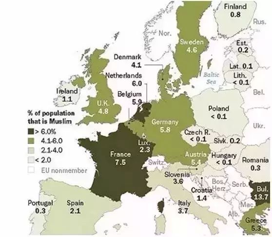下图是欧洲2010年的穆斯林比例数据,注意这是6年前的,经历了6年穆斯林人口的高出生率和2015年的难民潮,现在人数更多了。