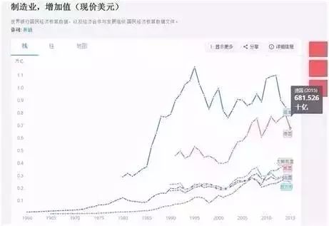 到2015年,中国的工业产值3.5万亿美元,已经超过了美国+日本之和的2.97万亿美元。我第一次听到这个数据在是中国人民大学国际关系学院院长金灿荣教授的讲座,他在不同的场合讲到了这个数据,即中国工业产值2010年超过了美国,2015年超过了美日之和,第一次听到这个,是非常震撼的,这跟媒体说中国制造落后西方几十年的印象完全不同。我在IMF,联合国和统计局网站查询,发现确实如此。
