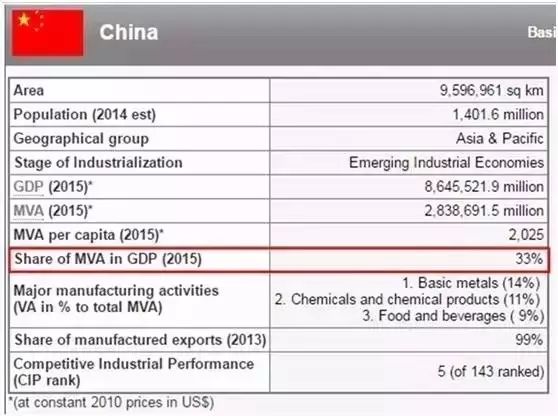我们登陆联合国工业发展组织,可以查到工业增加值MVA(manufactured value added)占GDP的比例,例如我们查下中国,显示是33%,这个数字和中国国家统计局的数字一致,可见联合国是直接采用中国的数字。