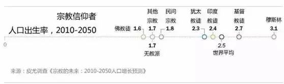 我们再看下人口的变化趋势,6个文明中,伊斯兰文明不仅人口规模最大,有17亿人,而且生育率最快,下图是皮尤调查中心调查的出生率,穆斯林达到了惊人的3.1的生育率,这个数字不一定100%精确,但是六大文明中穆斯林文明生育率最高是不争的事实。