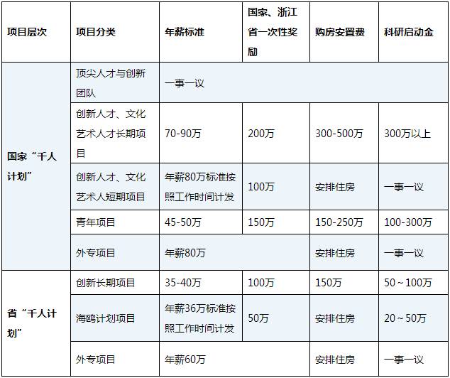 注:1)“千人计划”人才一次性奖励包含国家和浙江省的一次性补助和科学技术奖励,以国家和省按政策实际下拨为准,其中“外专项目”人才的一次性奖励已包含在年薪中。