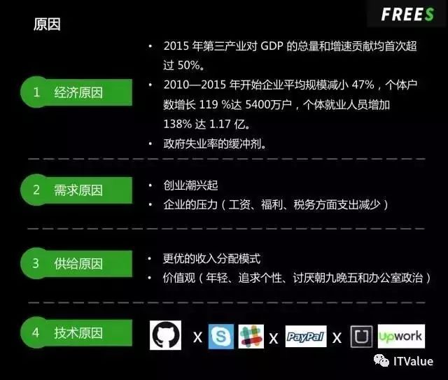 第三是劳动力供给的变化,目前70%的自由职业者都是85后,他们性格特质年轻,追求个性,讨厌办公室政治和朝九晚五,同时自由职业对他们而言是一个更优的收入分配模式。