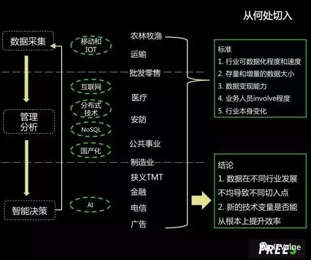 按照五个维度,我把不同行业做了简单 mapping :农林牧渔、运输和批发零售处于采集阶段;医疗、安防、公共事业和制造业处于第二个阶段到第三个阶段的过程;最下面是金融、电信、广告、狭义的 TMT,狭义的 TMT 是指业务基本在线上,线下部分比较轻的服务。O2O 和电商就不算狭义的 TMT。
