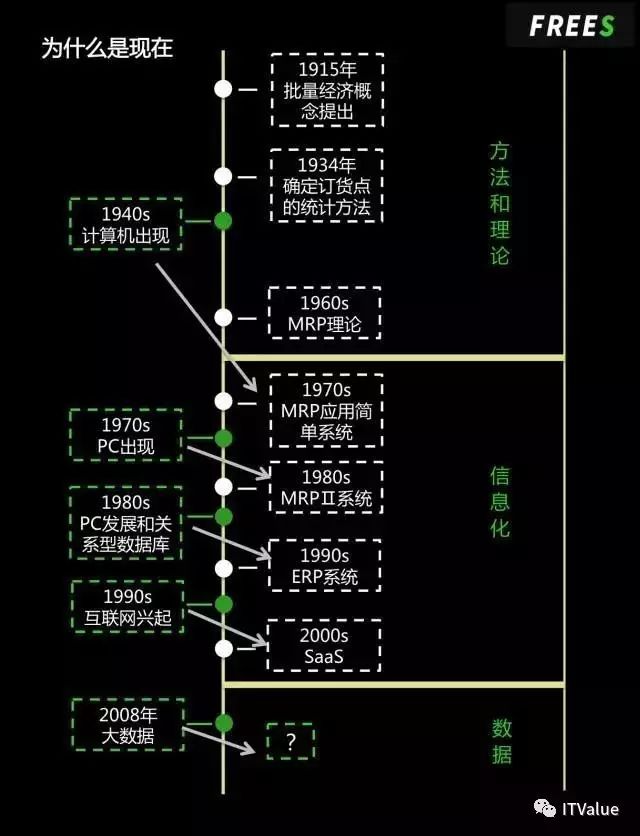 直到 20 世纪 40 年代中叶,第一台大型计算机才出现(它是军方用来做弹道计算的)。此时计算机行业没有给企业界带来巨大的变化。1950 年代末,美国制造行业的一些专家经理人成立了一个叫 APICS 的组织,这个组织成立几年后,制造行业内部运行的流程理论 MRP 才开始形成。至此理论应该相对完善了。