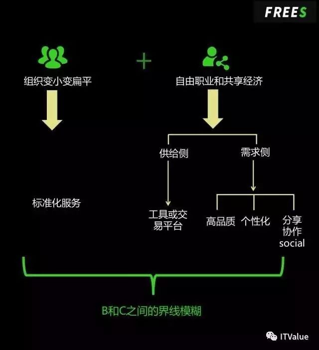 组织变小变扁平导致共性需求更多,因此做标准化的服务和产品更有可能。自由职业和共享经济的兴起,从供给侧来讲,当自由职业的供给多起来,会出现对应的工具和交易平台;从需求侧来讲,组织变小,人变年轻,就要求个性化、高品质的服务或产品,也更加看重分享、协作和 Social 功能。