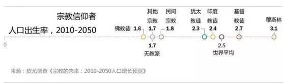 下图是皮尤调查中心调查的出生率,穆斯林达到了惊人的3.1的生育率,这个数字不一定100%精确,但是六大文明中穆斯林文明生育率最高是不争的事实。