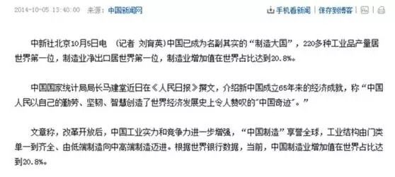 是不是觉得难以置信?如果说以上来自IMF和联合国的数据还不够印证的话,看看我国官方认证,2014年10月,中国国家统计局局长在《人民日报》发表的文章,中国2013年的制造业产值就已经达到了全世界的20.8%。