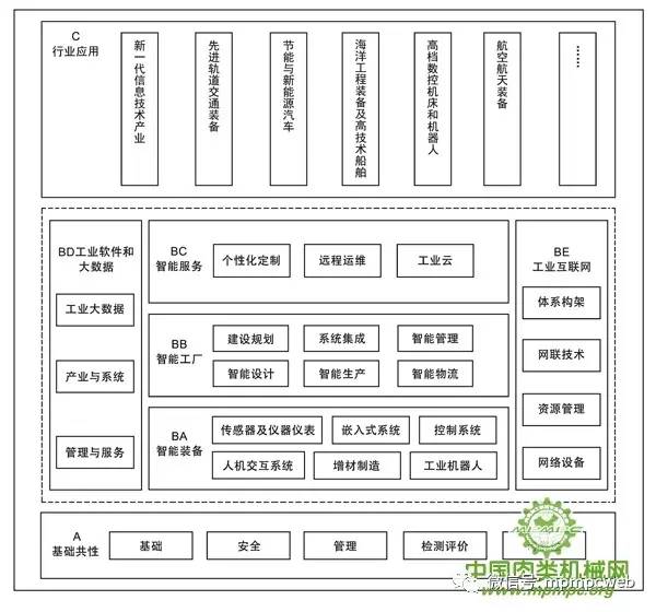 关键技术标准:BA智能装备标准与实际生产联系最为紧密;BB智能工厂标准,是对智能制造装备、软件、数据的综合集成;BC智能服务标准是对新模式和新工业互联网标准,贯穿B关键技术标准的其它3个领域(BA、BB、BC),打通物理世界和信息世界,推动向服务化转型。