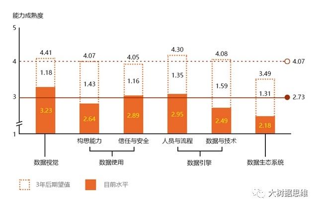 显然,公司不能同时提升所有能力。调查显示,几乎所有的能力,公司目前的水平和未来三年内渴望达到的水平都存在巨大差距。数据使用,数据引擎和数据生态系统的差距尤其明显。同时提升这么多能力对许多公司来说必然是一个挑战。