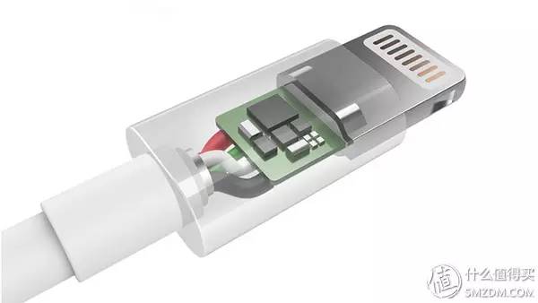 ▼ 放在产品上,MFI的数据线,Lightning端除了常规的组件外,还有一颗苹果的认证芯片,这个芯片搭配手机内部的电源管理IC,构成了整套的充电方案。