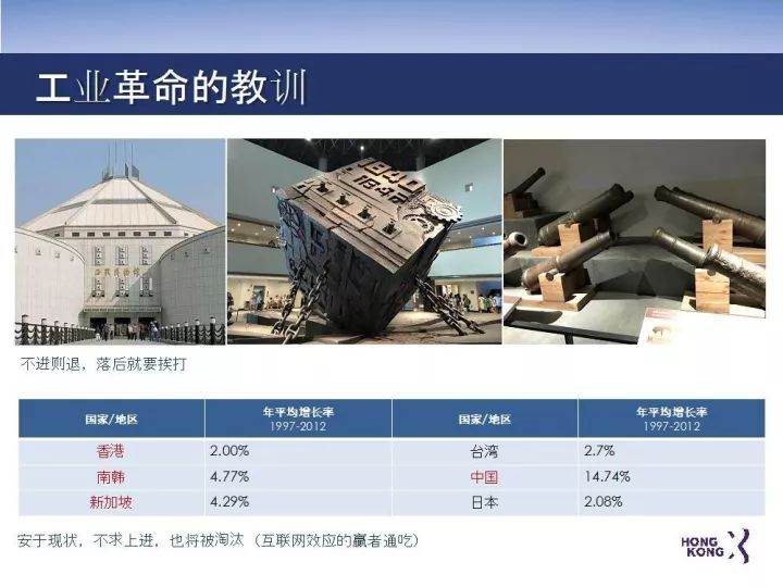 回顾过去二十年的香港,虽然保持3%的经济增长,但经济实力增幅低于竞争对手,长此下去亦难逃被淘汰的危机。如马化腾所说,在过去的世界里,即使屈居老二、老三、老四,一个城市或者一个企业仍有他们的地位。而在今天的互联网效应和技术的效应之下,不做老大就根本无法占一席之地。