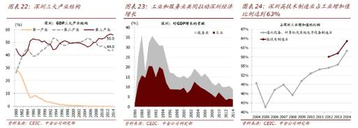 在临近香港的深圳,农业跟香港一样也逐渐息微,其占比亦下降到近乎零。在发展高科技的领域深圳理应跟香港同步,然而深圳的工业占比达44%。更重要的是深圳高技术制造业占到工业增长值的比例超过60%。在深圳的经济结构中,工业和服务业共同拉动深圳的经济发展。