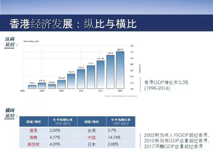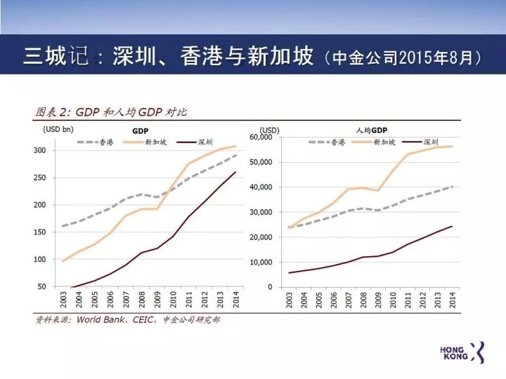 中金公司在2015年发表了一个名为 《三城记》的调研报告:对香港、新加坡、深圳,做了一个非常详细的对比。报告显示,香港的主要竞争对手新加坡的经济活力一直高于香港。2003年新加坡的人均GDP超过香港,2010年新加坡的GDP总量超过香港。深圳是香港的邻居,更是未来的合作伙伴,今年GDP总量也超过香港的总量。