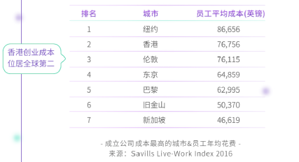 高昂房价导致的居于全球第二的创业成本(仅次于纽约,如上图);其次是政府制定的一些旨在帮助初创企业,但由于手续烦琐和操作不到位,不能落实或效果不佳的政策,如 ITF 给初创企业的科技资助项目、移民局的专才和优才引进政策。