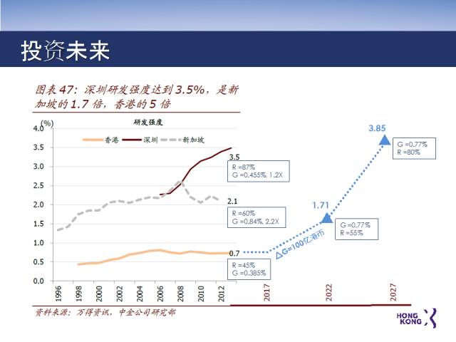 可以大胆的想象一下,未来十年,香港把两个参数进行优化,第一是政府领头增加投入。把政府投入从0.385%翻一倍,达到0.77%。政府投入增加民间投资的信心,拉动民间投入占比增加10个点,到55%。如此以来,预计在2022年,香港全社会的研发投入能够达到1.71%。在那以后,实时政府投入保持相同的数字,民间投入依然会接着往前走。就打破以前鸡跟蛋的问题。