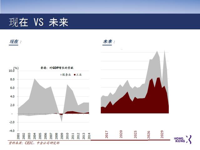 可以预计香港科技创新产业在未来10年对经济增长的贡献率就如下图所示,不再是忽略不计,而是其最重要的推动引擎。