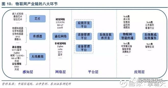 物联网产业链包含八大环节。芯片提供商、传感器供应商、无线模组(含天线)厂商、网络运营商(含 SIM 卡商) 、平台服务商、系统及软件开发商、智能硬件厂商、系统集成及应用服务提供商。物联网的体系架构自下而上分为四个层次:感知层、网络层、平台层、应用层。目前市场你发现没有正在热炒网络层,前段时间是感知层。而在这八大环节里面,最重要的就是芯片提供商和网络运营商。